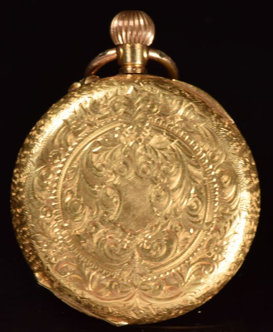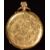 Unnamed 18ct gold keyless winding open faced pocket watch with gold hands, blue Arabic numerals, gilt decorated white enamel dial, engraved case and unsigned movement, case diameter 34mm, serial number 169225, 30.2g.