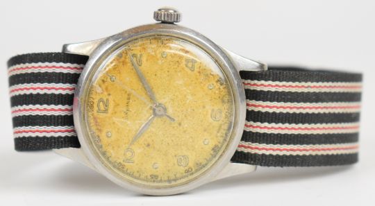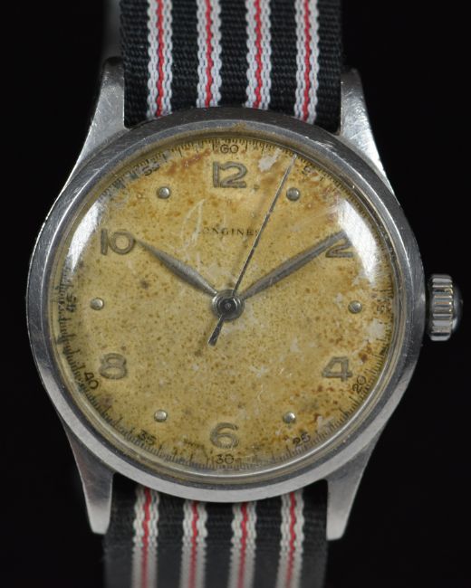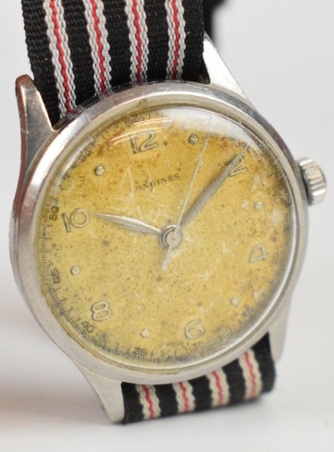 Longines gentleman's wristwatch ref. 13322 with steel hands, Arabic numerals and hour markers, tropical silver dial and signed 17 jewel movement, on NATO style canvas strap, case diameter 33mm, serial number 8699092.