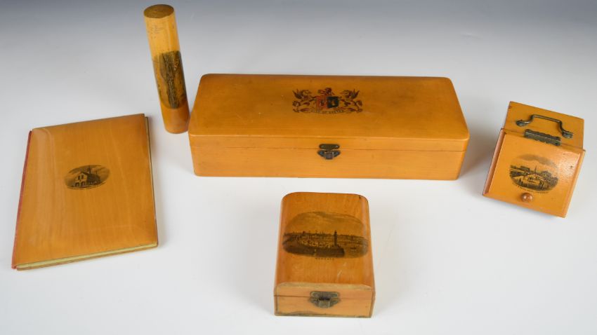 Five pieces of Mauchlineware comprising Exeter glove box, Pier and Royal Hotel Lowestoft coal scuttle / stamp box, Redesdale Hall Moreton in Marsh blotter, Ventnor Isle of Wight needle / bodkin case and a Margate box, tallest 19cm