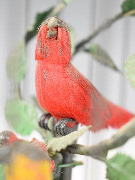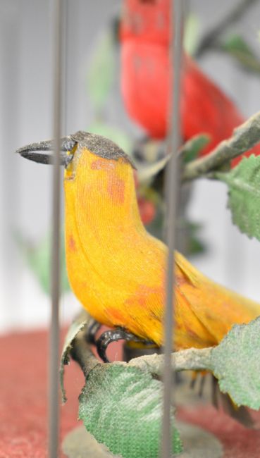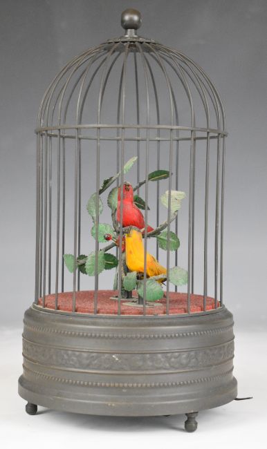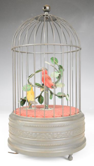 Pair of automaton singing birds in cage, one red the other yellow, with clockwork mechanism to base, overall height 26.5cm