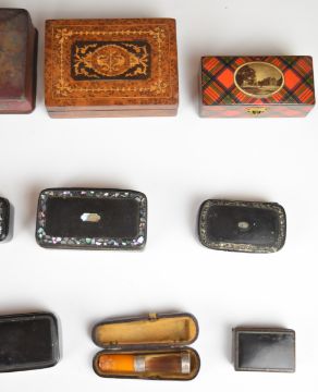 Two Tunbridge ware pin cushions, Sorrento ware boxes, Tartan ware Grantown boxes and a collection of Georgian / Victorian papier maché snuff boxes, some with mother of pearl inlay