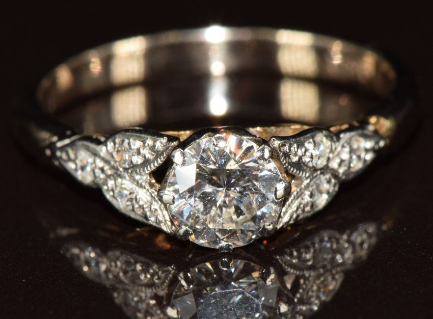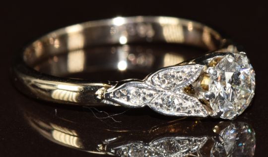 An 18ct gold ring set with a round cut diamond of approximately 0.6ct with diamond encrusted shoulders, 2.9g, size M