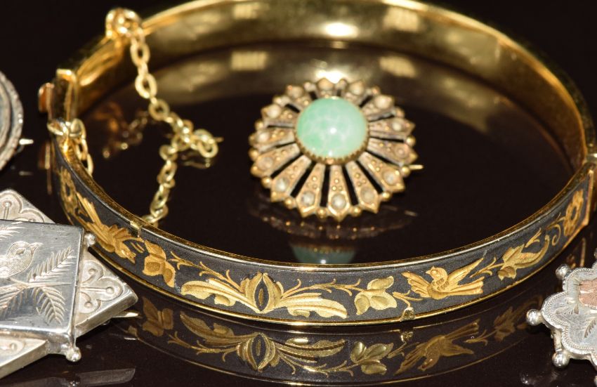 Three c1900 silver brooches, one with applied gold bird decoration (Birmingham 1891), a silver plated stamp holder and a Toledo bangle