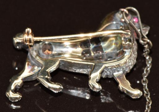 Victorian brooch in the form of a poodle set with old cut diamonds and ruby eyes, 9.6g, 2.8cm