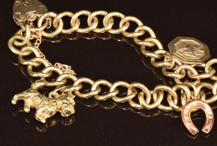 A 9ct gold charm bracelet with four 9ct gold charms including horseshoe, St Christopher, hat and dog, 18g