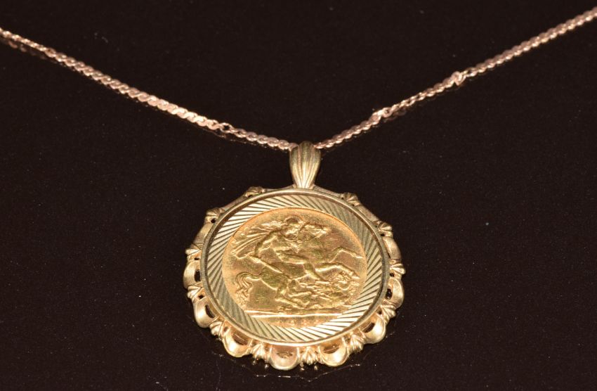 A 9ct gold pendant set with a 1982 gold half sovereign, on 9ct rose gold chain, 8.2g, 42cm