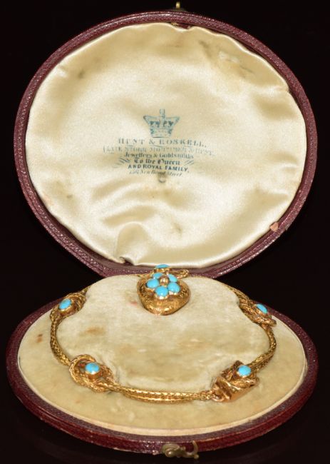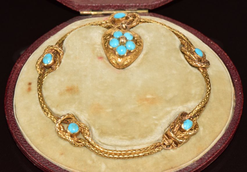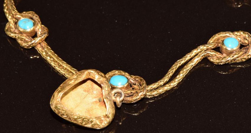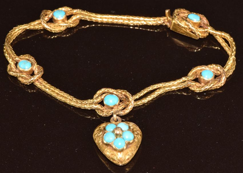 A c1880 gold bracelet made up of two plaited chains with knot detail set with turquoise cabochons, the heart pendant drop set with further turquoise cabochons and with engraved decoration, in original fitted Hunt and Roskell box, 11.8g, 17cm