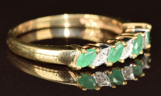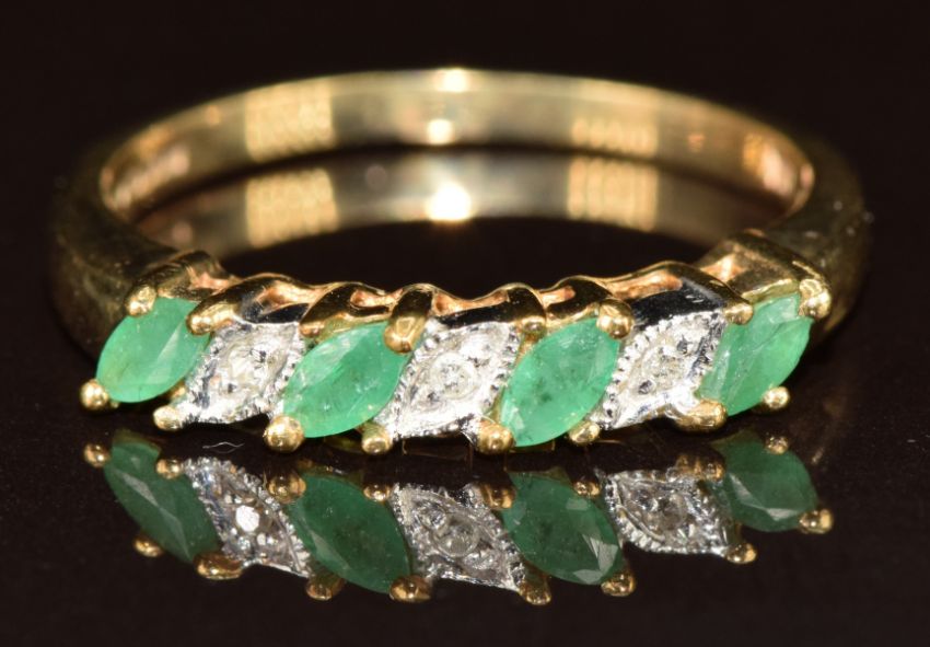 A 9ct gold ring set with marquise cut emeralds and diamonds, 2.5g, size O