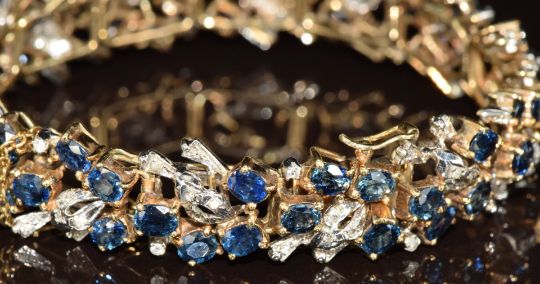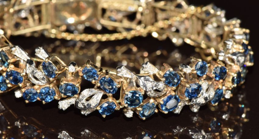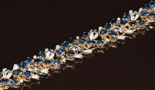 A 14ct gold bracelet set with fifty-two oval cut sapphires, each approximately 0.2ct and eighty round cut diamonds, 33.9g, 18cm