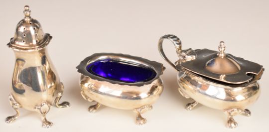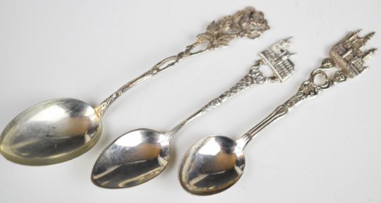 Hallmarked silver items comprising three piece cruet set, four pill pots, cocktail skewers with apple finials, propelling pencil and spoons etc, some marked 800, 250g of weighable silver incluidng 800 grade but most hallmarked