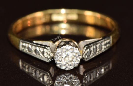 An 18ct gold ring set with a diamond in a platinum setting, 1.7g, size I