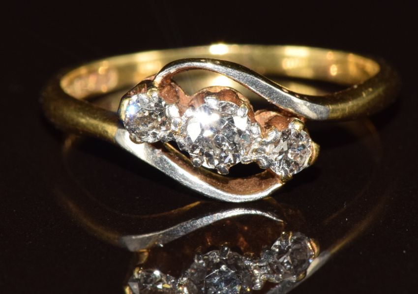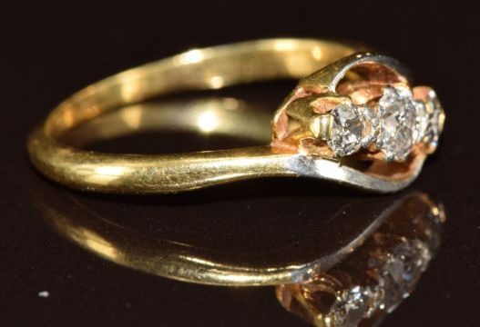 An 18ct gold ring set with three diamonds of approximately 0.2ct, 0.08ct and 0.08ct, 2.8g, size O