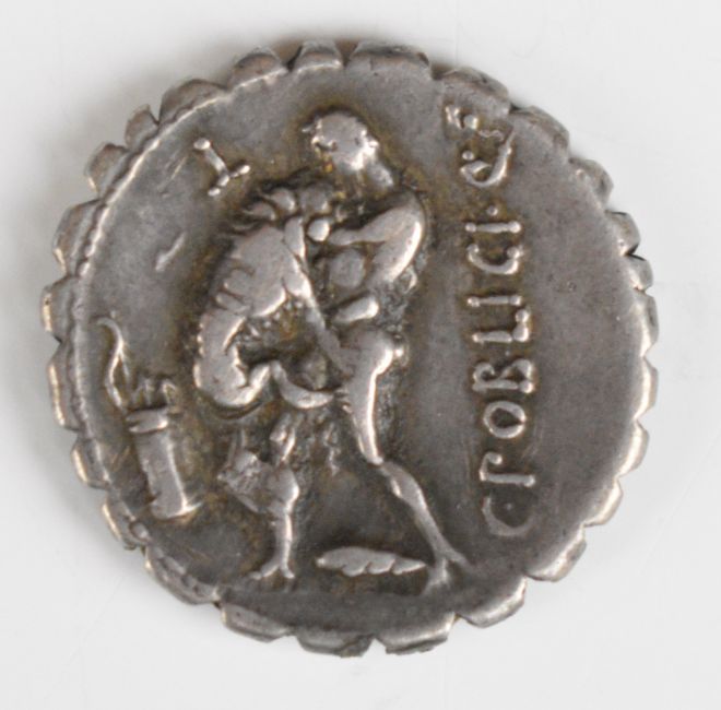 Roman serrated silver Denarius of C. Poblius 80 BC, Roma right rev Hercules facing left strangling the Nemean lion