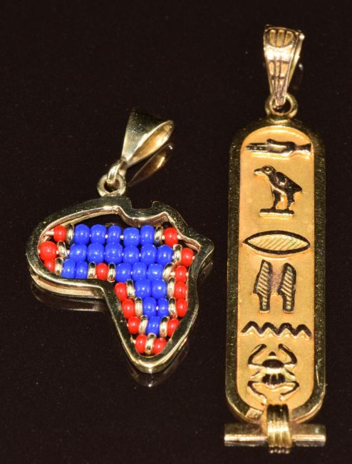 An 18ct gold Egyptian pendant (2.8g, 4.7cm) and a 14ct gold pendant in the form of Africa set with beads (2.6g, 1.7 x 3cm)