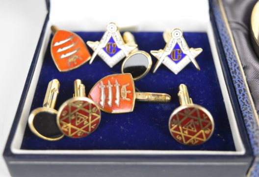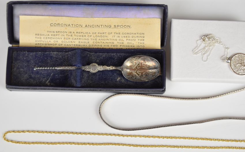 A collection of jewellery including yellow metal Masonic sphere charm folding out to reveal Masonic symbols, silver items including necklace, two brooches, cufflinks and Queens Jubilee dish, silver gilt earrings, etc
