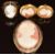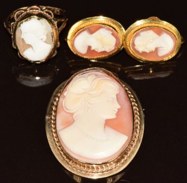 A 9ct gold ring, brooch and earrings, all set with cameos, 13.8g