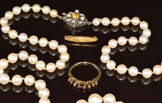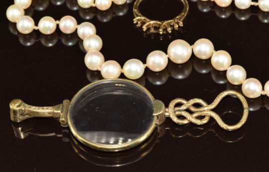 A single strand of cultured pearls, 9ct gold ring mount, lorgnette with serpent handle and a 9ct gold brooch