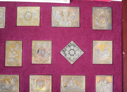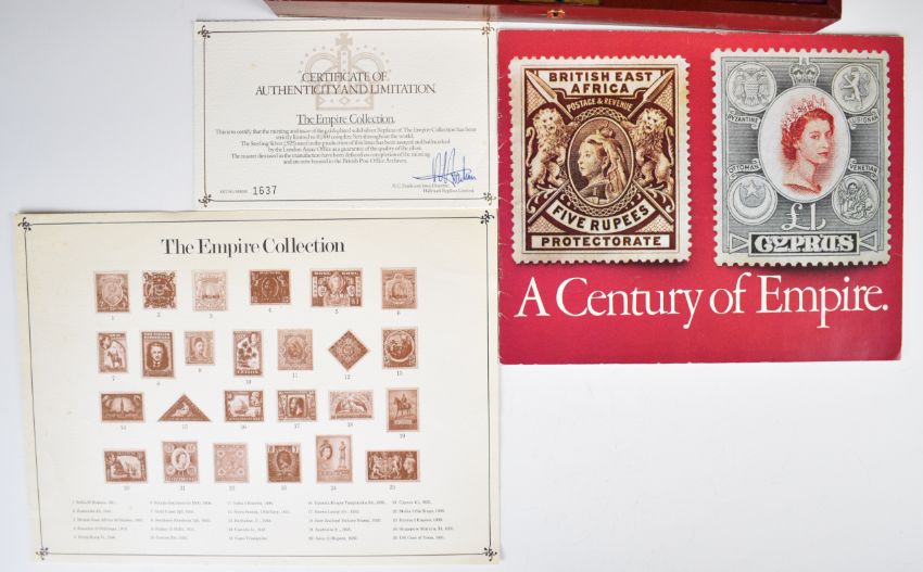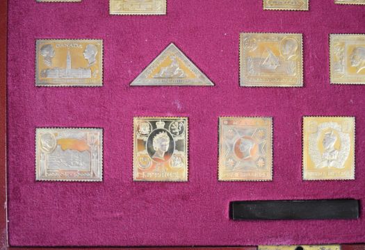 Hallmark Replicas Empire Replicas cased set of 25 hallmarked silver gilt replica stamps, weight of all stamps 467g, in leather case with certificate of authenticity, width of case 33cm