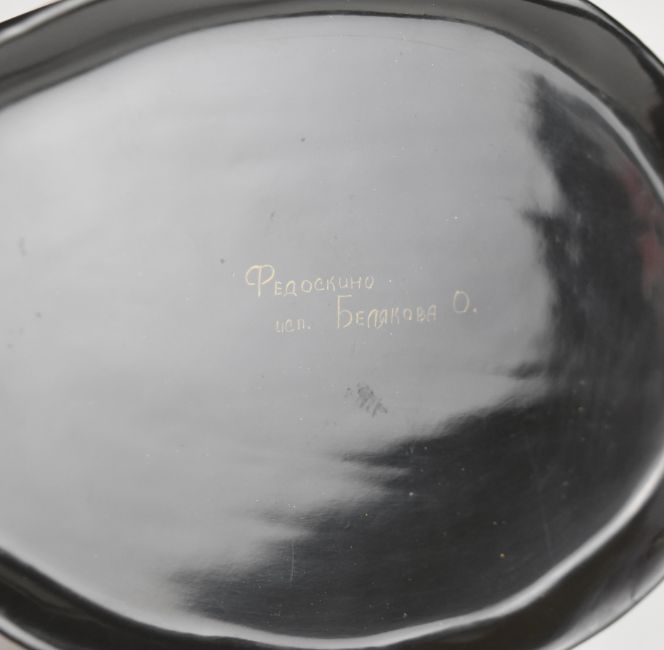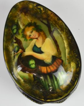 Four large Russian lacquer boxes comprising girl picking apples by Belpakoba, Snow White and the Seven Dwarfs by E Krasnob, Troika in Susdal by Semenoba and The Magic Squirrel by E Fillippoba, largest 15 x 24cm