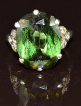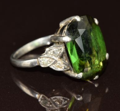 Art Deco platinum ring set with an oval cut tourmaline of approximately 6ct and three diamonds to each shoulder, 5.1g, size G