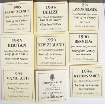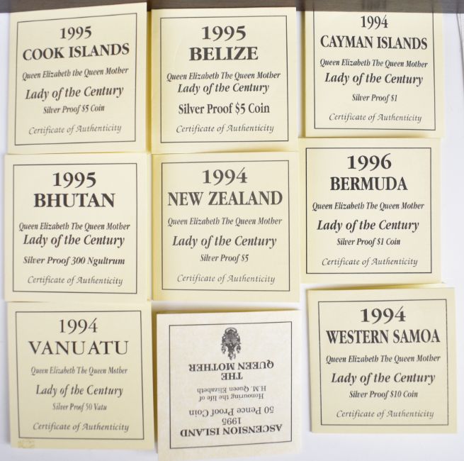 Twelve Queen Elizabeth the Queen Mother silver proof coins comprising 1995 Cook Islands $5, 1994 Vanuatu 50 Vatu, 1994 Western Samoa $10, 1995 Bhutan 300 Ngultrum, 1994 New Zealand $5, 1995 Ascension Island 50p, 1995 Belize $5, 1996 Bermuda $1, 1994 Cayman Islands $1, 1995 Guernsey £5, 1994 Fiji $5 and 1995 Barbados $1, all in capsules with certificates, in case, total weight of coins 325.56g, together with two 1980 crowns