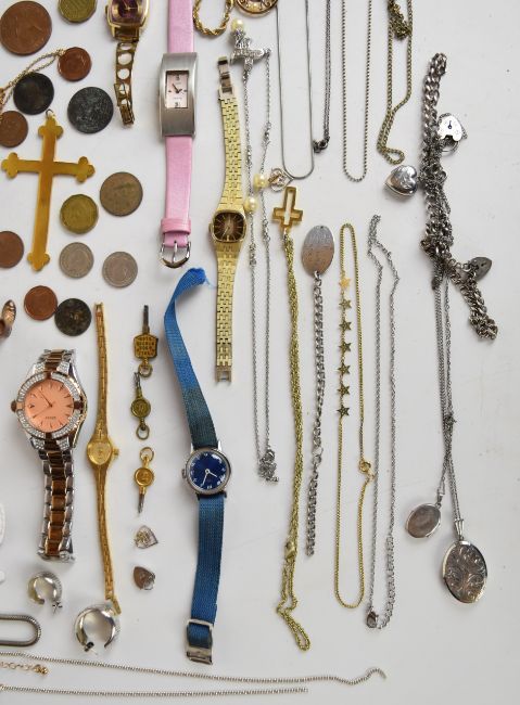 A collection of jewellery including 9ct gold pearl stud earrings, watch keys, silver items including three chains, three lockets, two bracelets, four pairs of earrings and a ring, Victorian gilt cross, watches, etc (silver 50g)