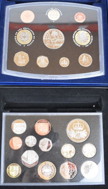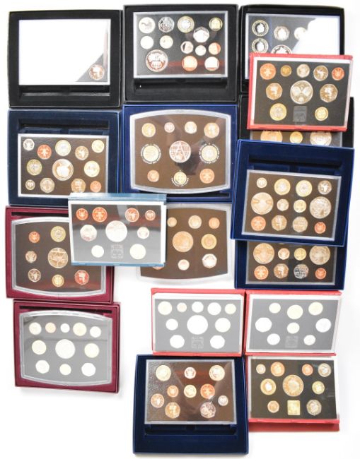Seventeen UK proof coin sets comprising 1986, 1996, 1997, 1998, 1999, 2000, 2001, 2002, 2003, 2004, 2 x 2005, 2007, 2 x 2008, 2010 and 2011, all in original Royal Mint cases/boxes