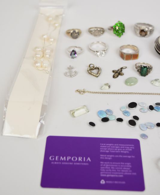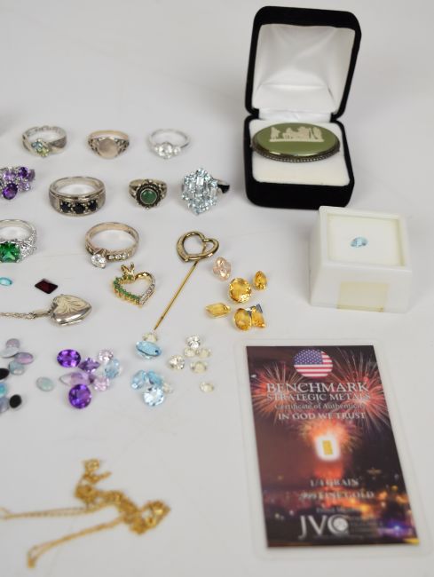 A collection of jewellery including freshwater pearls on silver chain, twenty silver rings including amethyst, topaz, cubic zirconia, sapphire, etc (98g), silver gilt pendant on chain, 800 grade silver pocket watch, carved tiger's eye cufflinks, Wedgwood brooch, 1/4g grain of fine gold, silver stick pin, silver locket on chain, and a collection of loose gemstones including opal triplets, quartz, five blue topaz (12.2ct), four amethyst (7.1ct), an aquamarine (0.9ct), five citrine (14.6ct), garnet (1.5ct), etc