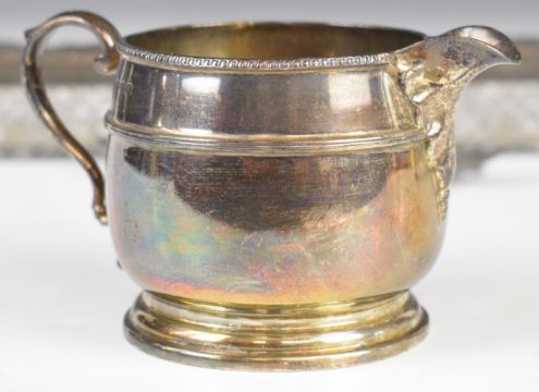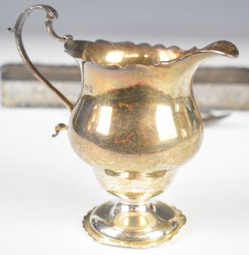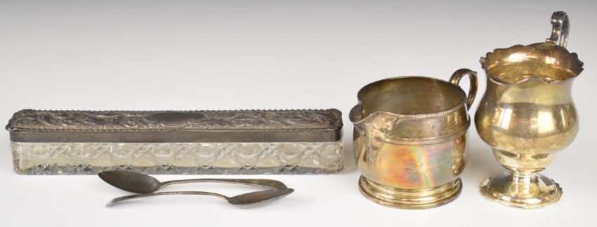 Mappin & Webb hallmarked silver milk jug, hallmarked silver pedestal milk jug, two Georgian hallmarked silver teaspoons and a long hallmarked silver lidded cut glass dressing table pot, length of pot 22cm, 294g weighable silver
