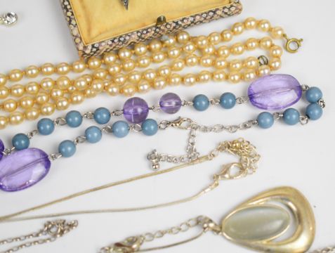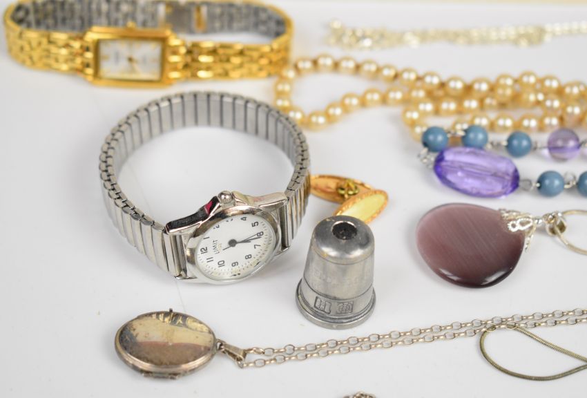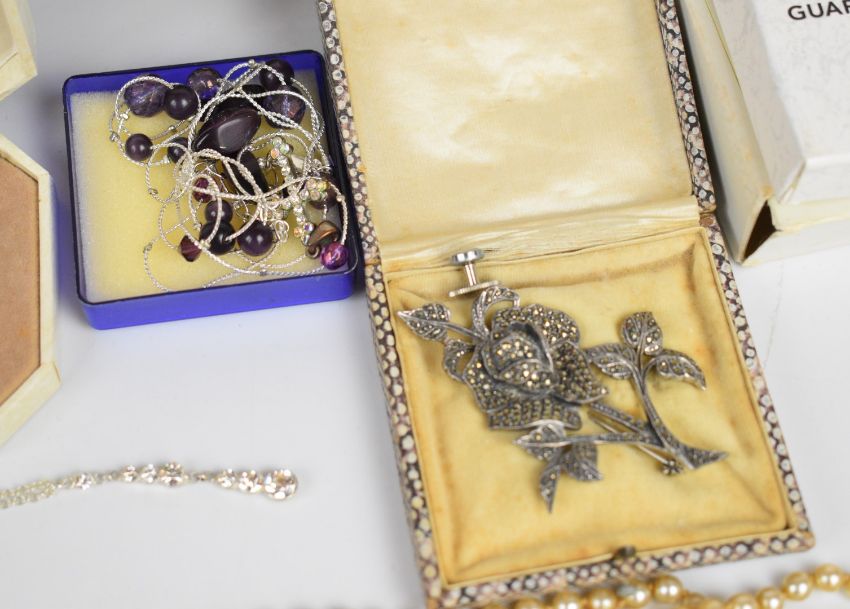 A collection of costume jewellery including 9ct gold cufflinks (3.3g), 9ct gold pendant set with rubies on chain (1.2g), silver brooch set with marcasite, stud and cufflinks set with mother of pearl, silver ring, silver locket on chain, etc