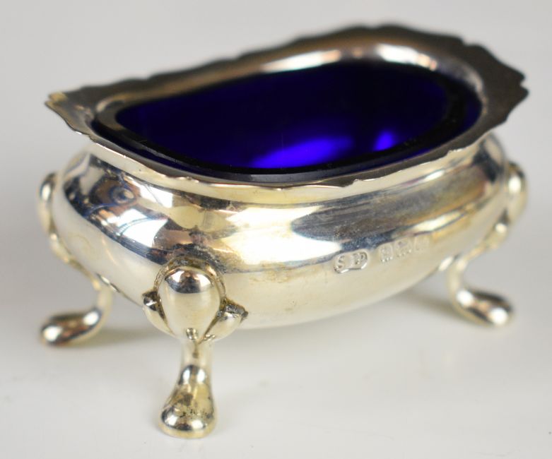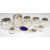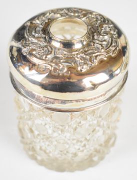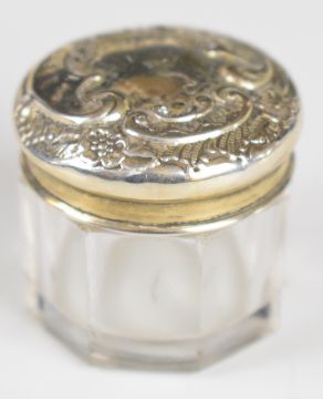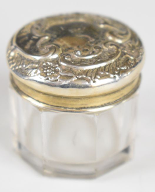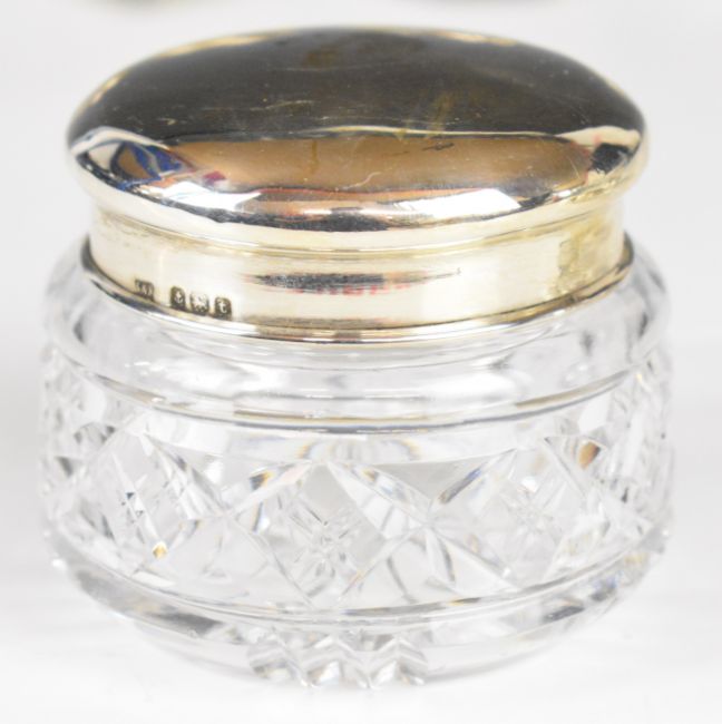 Seven various hallmarked silver lidded dressing table bottles, further loose lid and a hallmarked silver salt with blue glass liner, weight of all lids 105g