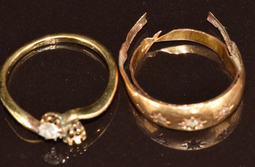 An 18ct gold ring (damaged) and an 18ct gold ring mount (stones missing), 4.3g