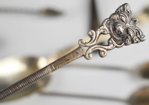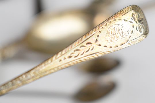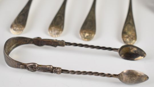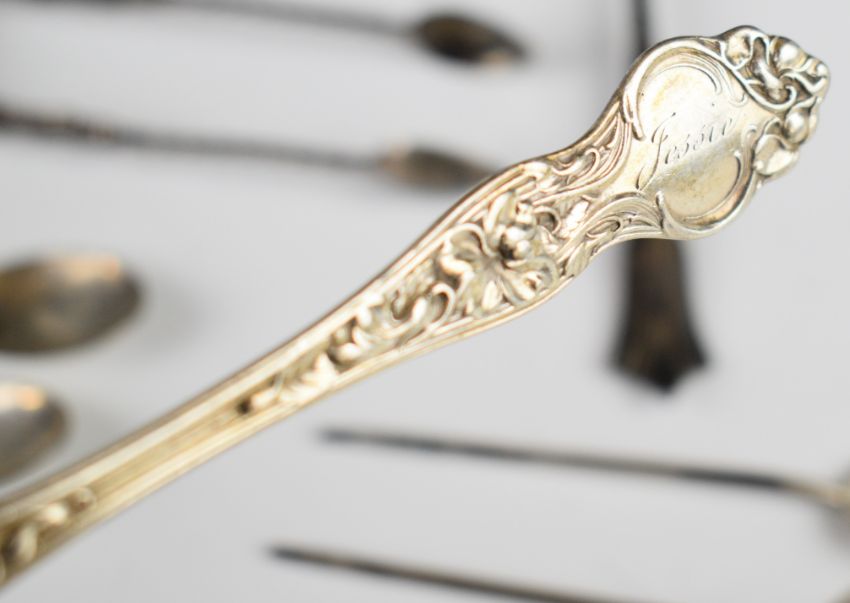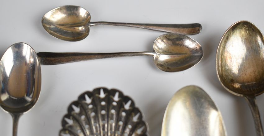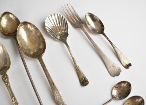 Hallmarked and other silver cutlery to include pair of Art Nouveau spoons, sifter spoon, set of five Victorian teaspoons and an American spoon marked sterling, length of longest 20cm, weight of all items 274g