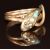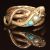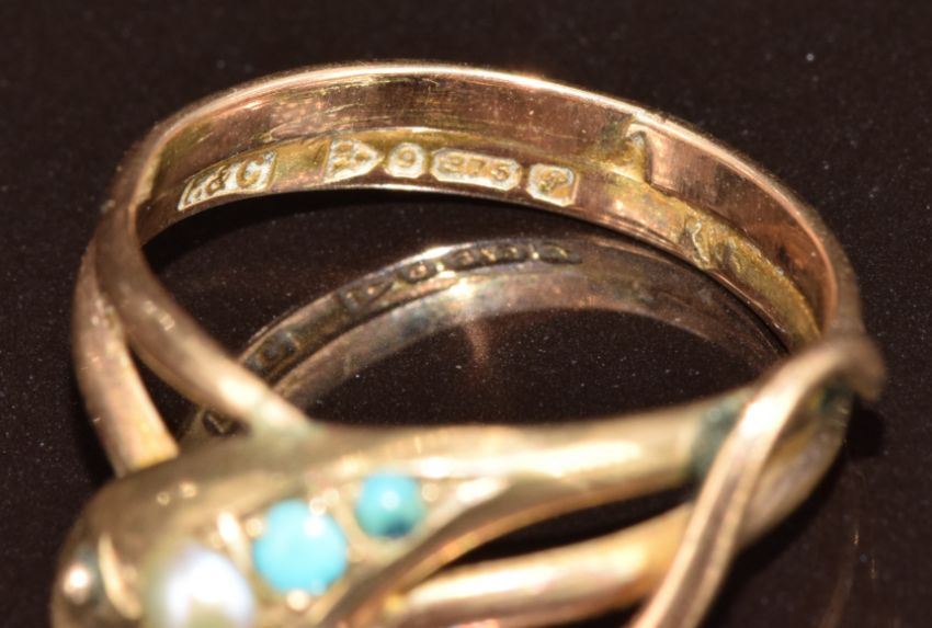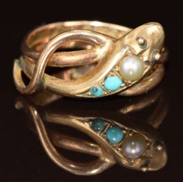 A 9ct gold ring in the form of a serpent set with two turquoise cabochons and a split pearl, Chester 1915, 3g, size O