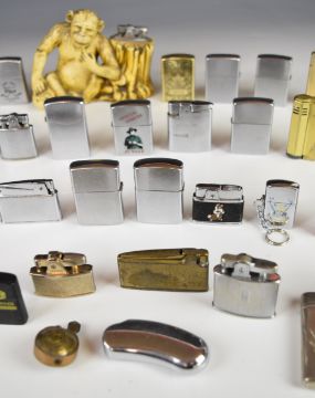 Prince table lighter in the form of monkey / chimpanzee resting against tree stump and a collection of forty pocket cigarette lighters to include Marlboro, Superkings, Royals, Motor Cycles Eagle Doubleflame, Flick, Zippo, Noble, Mosda Streamline, Ronson (various), Rodan, Calibri, Hestia, Imco Austria, Kingsway, Comoy’s, Penguin, Hadson, Corona, Duxette Trench lighter, Champ Special Forces