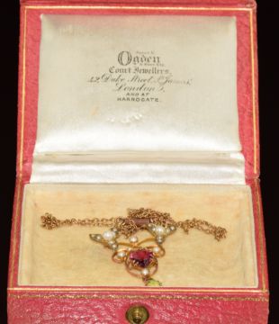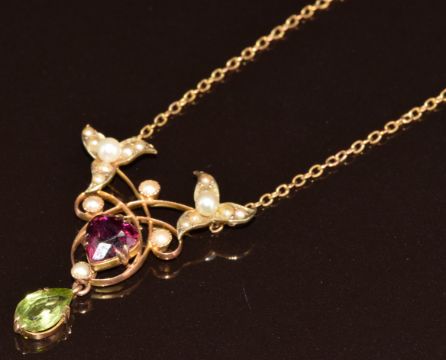 Edwardian 9ct gold Suffragette necklace set with a pear cut peridot, pearls, split pearls and a garnet, with antique 'Ogden, 42 Duke Street, St James, London' box, 5.6g