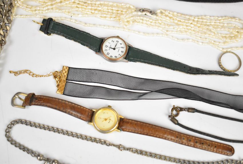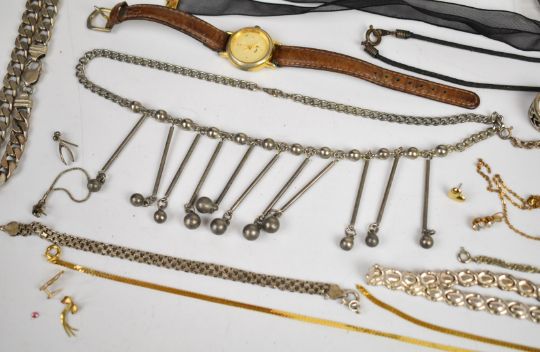 A collection of costume jewellery including silver earrings, opal boulder pendant, silver plaited ribbon necklace (16.2g), freshwater pearl necklace, silver curb link necklace (58g), two silver rings, silver necklace (28g), silver bracelets, etc