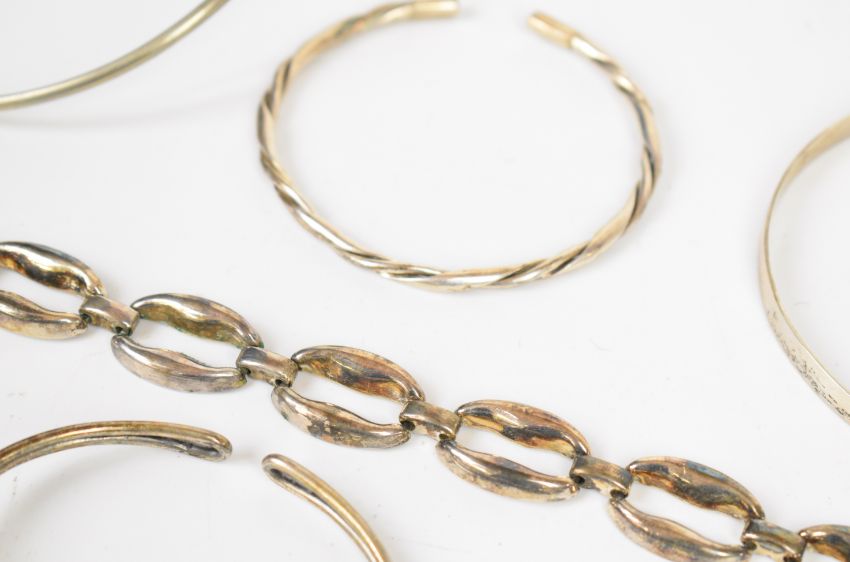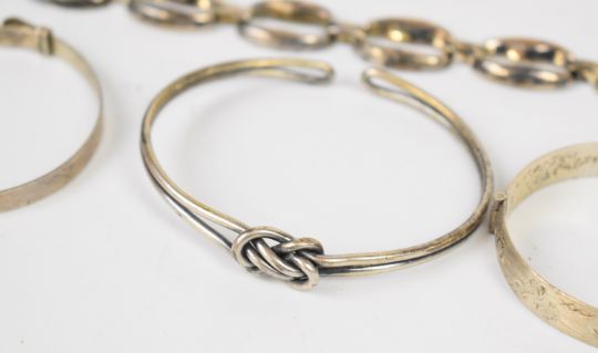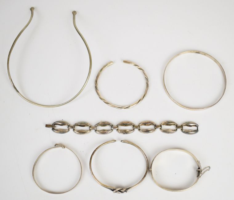 A collection of silver/ white metal jewellery including flapper bangle, knotted bangle, three other bangles, serpent choker/ necklace and bracelet, 110g