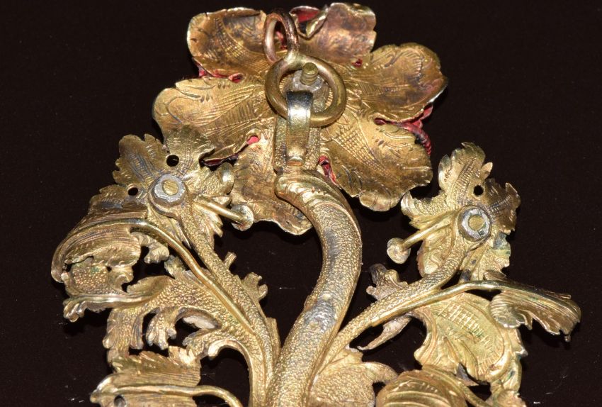 An early 19thC silver gilt pendant / brooch set with foiled emeralds, citrines and rose cut paste, with further drop emeralds and enamel decoration, 9 x 6cm, in original fitted Harvey and Gore, Vigo Street, London box