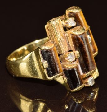 An 18k gold 1970's ring set with tiger's eye and diamonds, 10g, size O