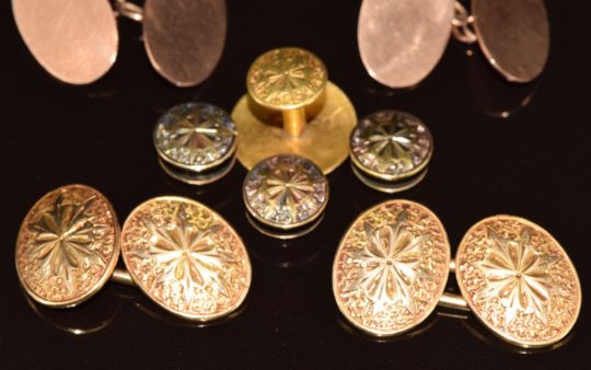 A pair of 15ct gold cufflinks with engraved decoration, Birmingham 1877 with four matching 15ct gold studs (13.6g) and a pair of 9ct rose gold cufflinks, Chester 1921 (5.1g)