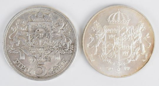Five Sweden and Latvia silver coins 1932-1980 including a 1932 Latvia 5 Lati, very high grade 1940 Sweden 2 Kroner and three commemorative Sweden silver coins from 1972-1980, two being sterling silver, weight of all coins 112g