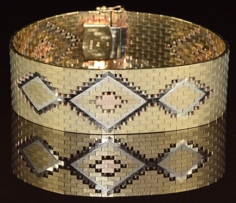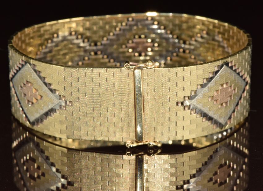 A 9k gold tri-coloured bracelet with a matte finish and diamond decoration, 43.5g, 18.5cm
