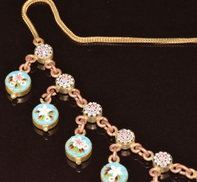 A 19thC micro mosaic necklace made up of circular links depicting flowers, marked A.F, 38cm