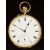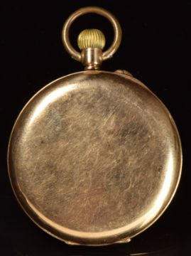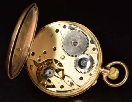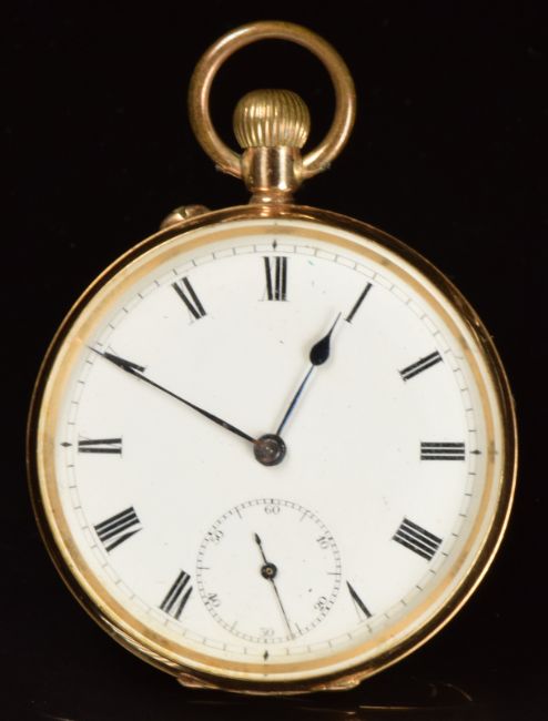 Unnamed 14ct gold keyless winding open faced pocket watch with blued hands, black Roman numerals, white enamel dial and unsigned movement, case diameter 46mm, serial number 119381, 65g.