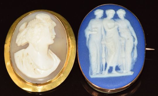 An 18ct gold brooch set with a signed cameo (3.3 x 4cm, no pin) and a 9ct rose gold brooch set with a Wedgwood plaque depicting The Three Graces (3 x 4.4cm)