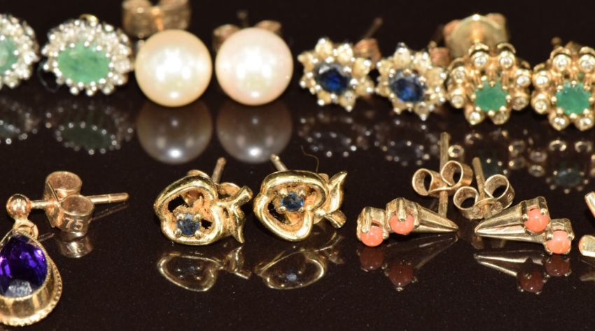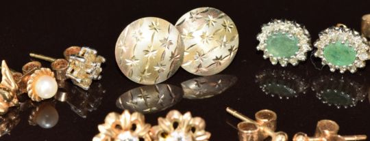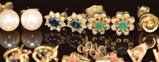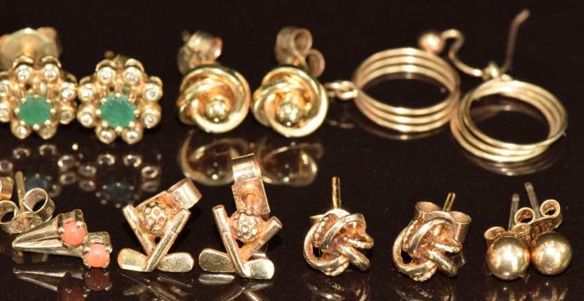 Twelve pairs of 9ct gold earrings including amethyst, emerald and diamonds, golf related, knots, etc, 11.7g