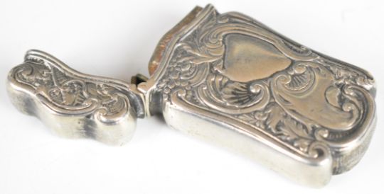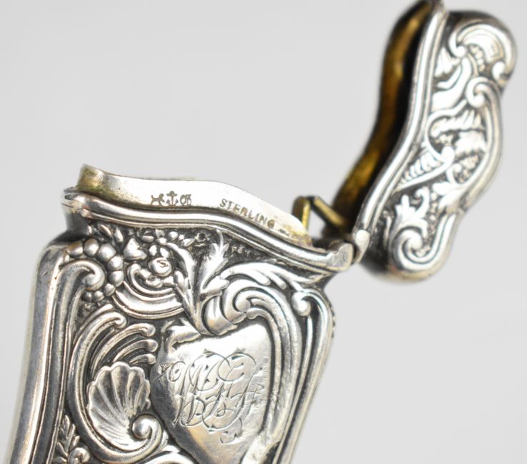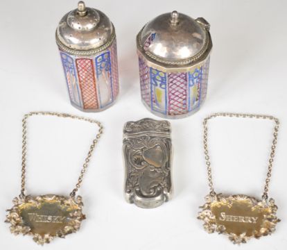 Pair of Elizabeth II hallmarked silver bottle tickets for Sherry and Whisky, London 1969, maker Israel Freeman & Son Ltd, American silver vesta case marked sterling and two Arts and Crafts style silver lidded glass condiments, weight of bottle tickets and a vesta 63g