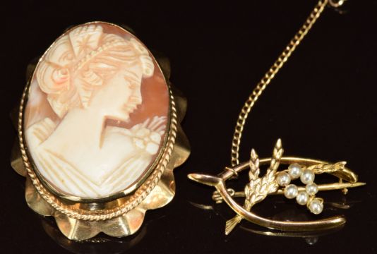 A 9ct gold brooch set with a cameo and a 9ct gold brooch in the form of a wishbone and heather by WBS, 12.6g