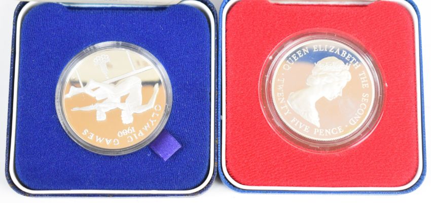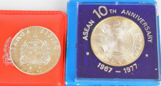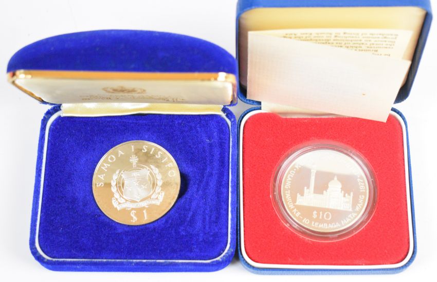 Cased silver proof coins comprising 1978 Guernsey Royal Visit 25p, 1977 Brunei $10, 1980 Tala Olympic Games $10, 1977 Western Samoa $1 and similar 1978 Pacific Flight $1, 1977 Singapore $10, 1980 Western Samoa Olympic $10 and two 1976 United States of America silver proof sets, together with a hallmarked silver butter knife and coffee spoon, 205g 0.925 silver, 62.5g 0.500 silver and 84g 0.400 silver